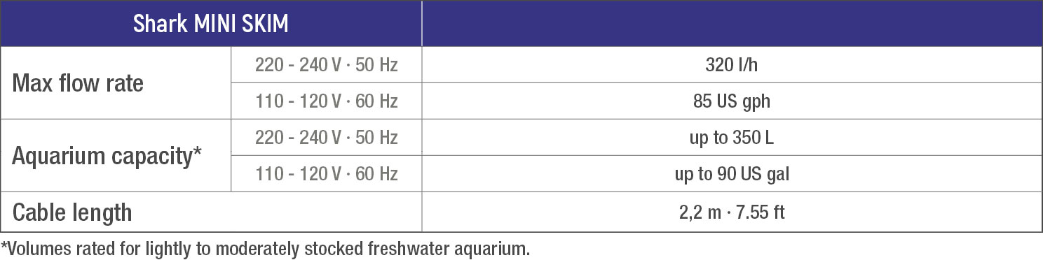 Shark MINI SKIM effectively filters surface water, quickly and accurately freeing it from floating objects such as plant debris, dust and those annoying molds that can cause a reduction in the necessary air exchange essential to keeping the ecosystem healthy of the aquarium.